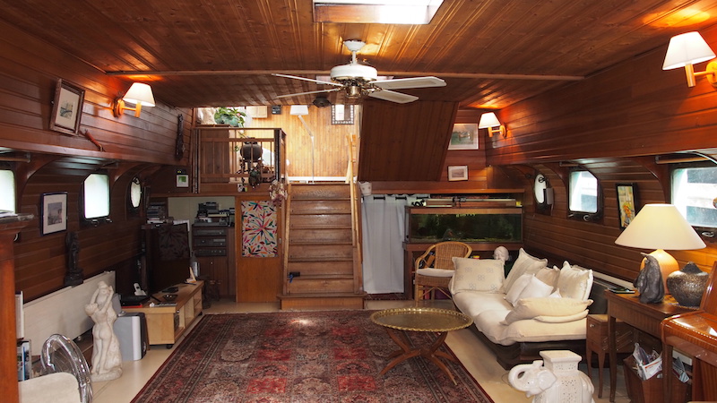 Elle comprend un logement principal de 5 pièces, grand salon, salle à manger, cuisine, 3 chambres, salle de bains et l’ancien logement de marinier avec son accès indépendant par la timonerie mais néanmoins relié à la partie principale. Il comprend 2 cabines doubles, salle d’eau, WC, petit salon.