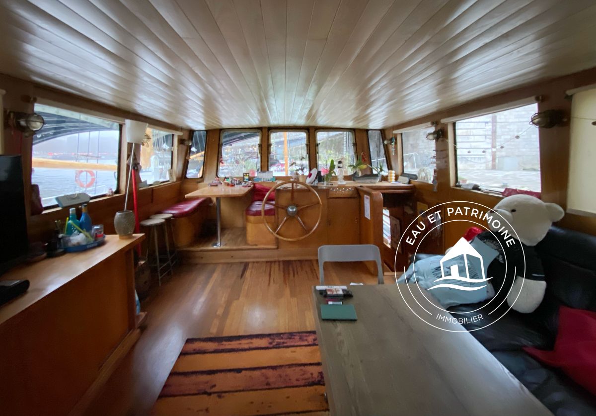 Péniche d’habitation en très bon état, située à Paris, XVème arrondissement, comprenant une grande timonerie, pièce de vie, en surplomb ; en bas : salon avec cuisine ouverte, 2 cabines dont 1 vaste avec dressing, salle de bains avec douche et baignoire.