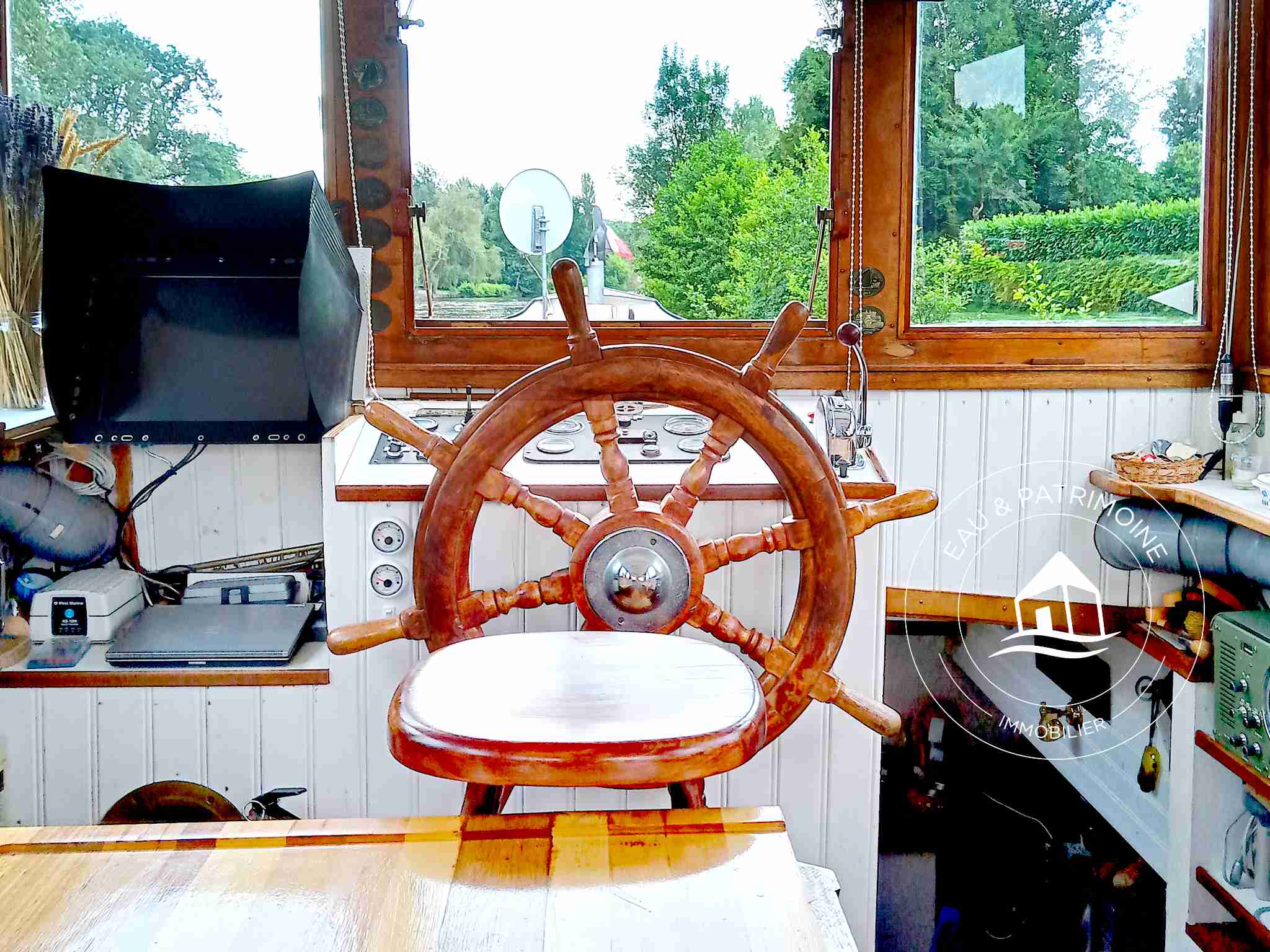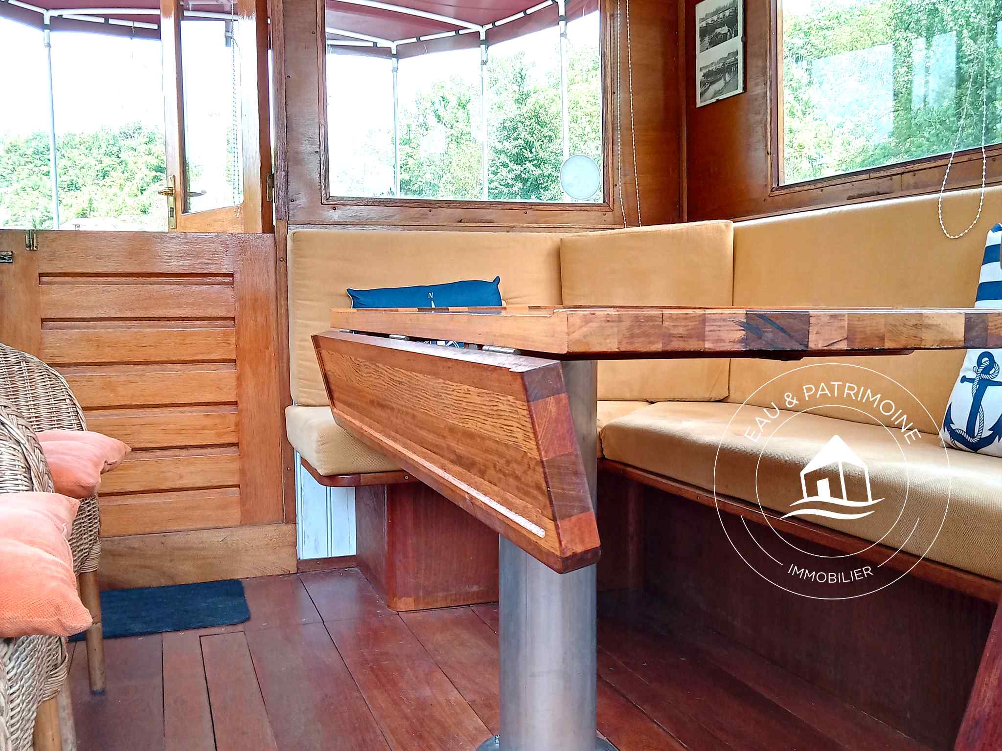 La timonerie agrandie (pièce au dessus de l’eau qui abrite le poste de pilotage), entièrement vitrée, possède une table et des banquettes, ainsi que la barre et les instruments de navigation.