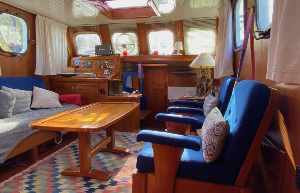 Vaste salon central très lumineux, dont les hublots et fenêtres sont équipés de stores et de rideaux. Toit ouvrant.